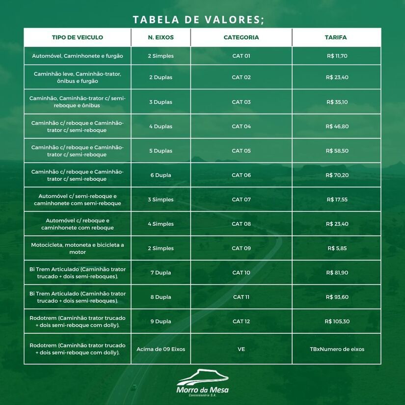 A concessionária Morro da Mesa anunciou que, a partir deste dia 1º de abril, o valor da tarifa de pedágio no trecho da MT-130 entre Primavera do Leste e Rondonópolis passou a ser de R$ 11,70.