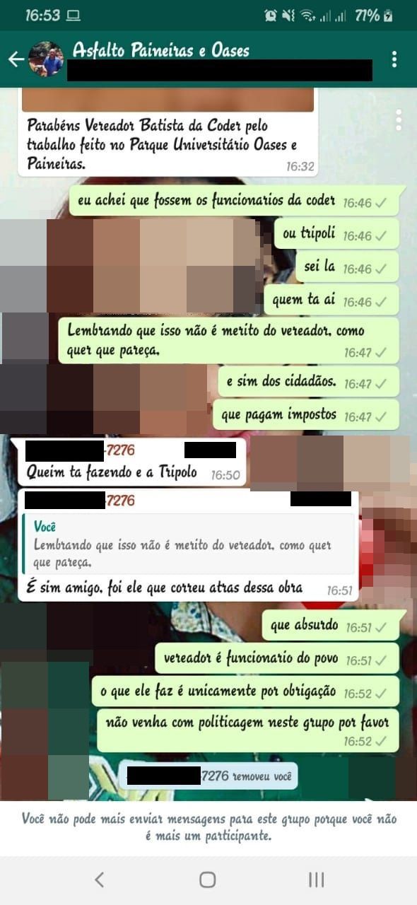 O assessor do vereador Batista da Coder ainda tentou contra-argumentar, mas, quando viu que não ia mudar o pensamento o participante, removeu ele do grupo. Para o azar do assessor e também do vereador, o morador jogou a conversa em outros grupos e a conversa viralizou.
