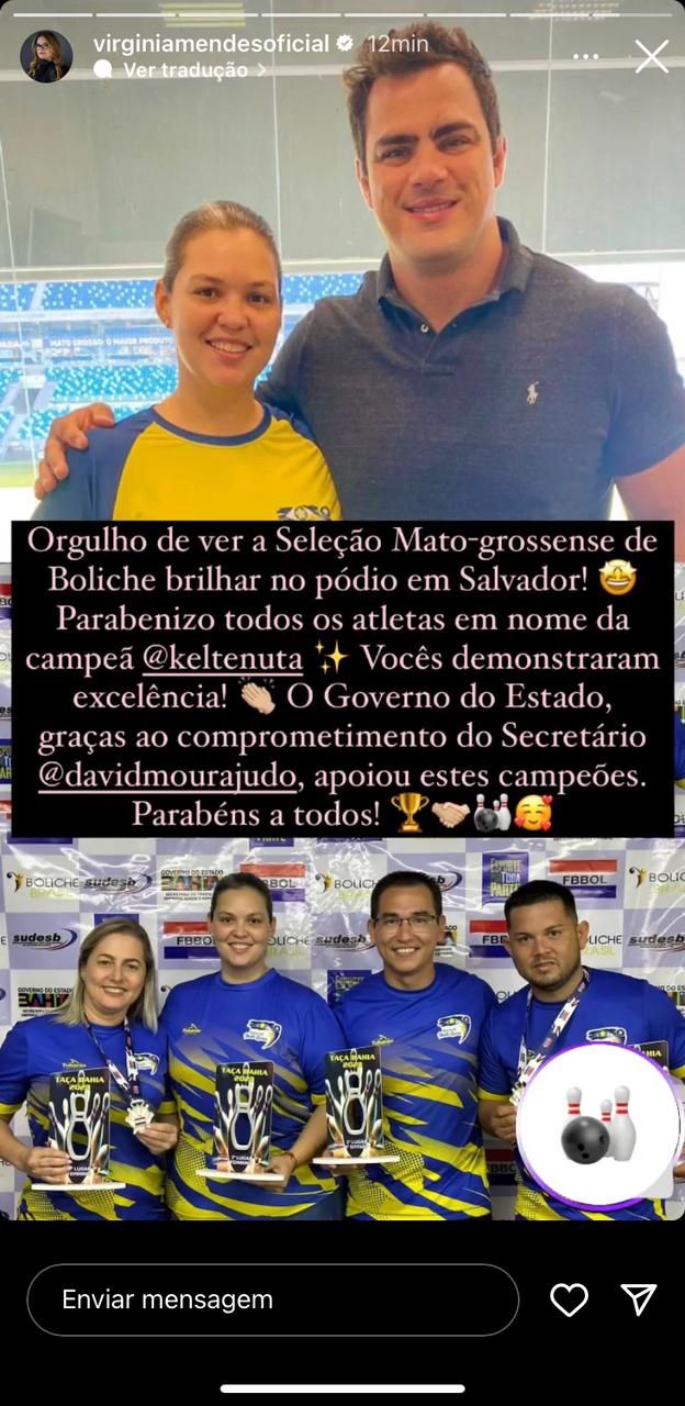 Na publicação, Virginia Mendes destacou o orgulho das equipes e o apoio do secretário-adjunto da Secel, Davi Moura. “Orgulho de ver a Seleção Mato-grossense de Boliche brilhar no pódio em Salvador! Parabenizo todos os atletas em nome da campeã Raquel Tenuta. Vocês demonstraram excelência. O Governo do Estado, graças ao comprometimento do secretário Davi Moura, apoiou estes campeões”, parabenizou Virginia Mendes.