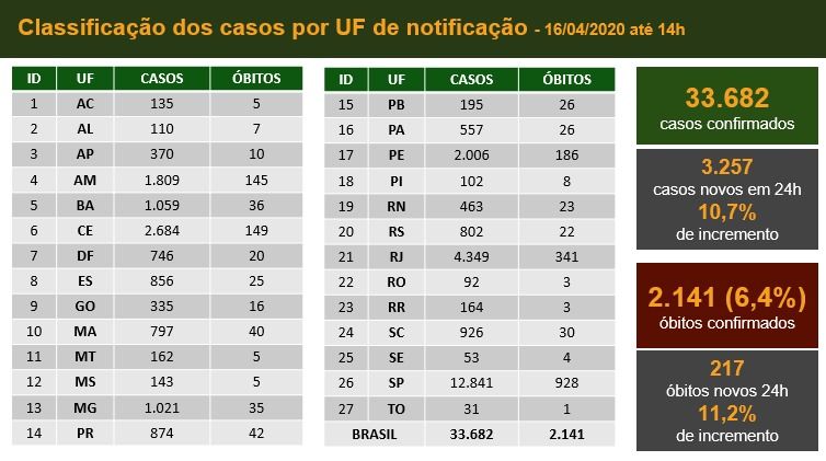 O número de mortes marcou um aumento de 11% em relação a ontem, quando foram registradas 1.924 vítimas da covid-19. Já os casos confirmados representaram um crescimento de 10% sobre os dados de ontem, quando foram contabilizadas 30.425 pessoas infectadas.