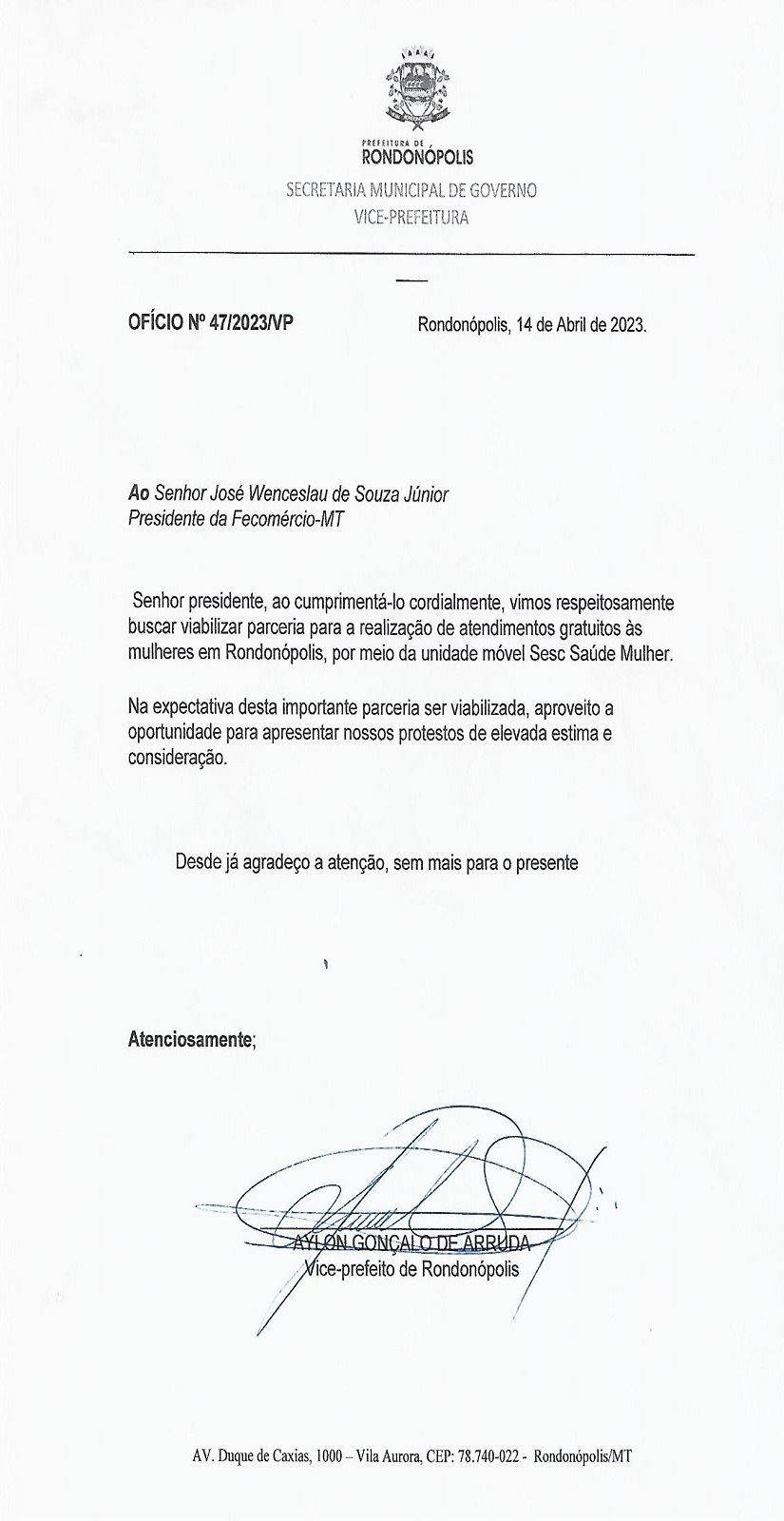 Oficio do vice-prefeito pedindo o ‘Sesc Saúde Mulher’ para Rondonópolis.