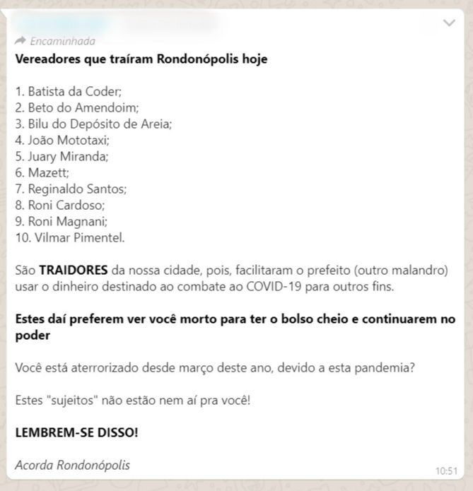Em uma postagem foi escrito os nomes dos 10 vereadores que votam a favor do veto ou se abstiveram de manifestar o voto. E na sequência, “São TRAIDORES da nossa cidade, pois, facilitaram o prefeito (outro malandro) usar o dinheiro destinado ao combate ao COVID-19 para outros fins”.