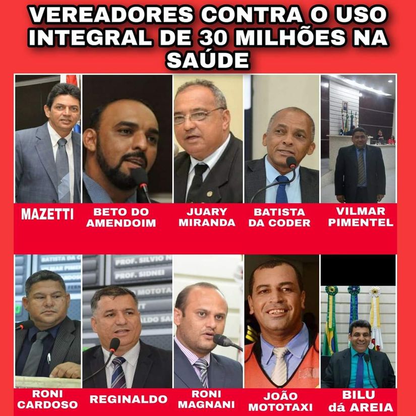 Já em outra postagem as fotos e nomes desses mesmos vereadores foram expostas, juntamente com a frase: "vereadores contra o uso integral de 30 milhões na saúde".