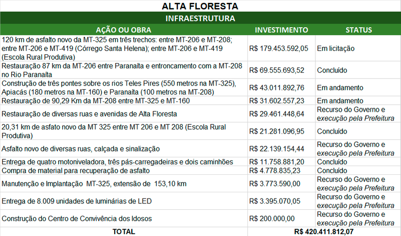 Na Infraestrutura, a principal ação do Governo de Mato Grosso foi a restauração de 87 km da MT-206 entre Paranaíta e o encontramento da MT-208, com investimento total de R$ 69,5 milhões. O Estado também investiu R$ 21,2 milhões em 20 km de asfalto novo da MT-325, entre a MT-206 e MT-208.