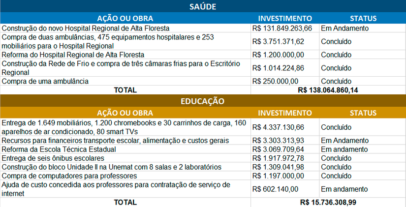 Para a Saúde, o principal investimento é a construção do novo Hospital Regional de Alta Floresta. Avaliada em R$ 131,8 milhões, a unidade contará com 151 leitos, sendo 111 leitos de enfermaria e 40 leitos de UTI, entre adulto, pediátrico, neonatal e unidade semi-intensiva neonatal, para atendimentos de média e alta complexidade.