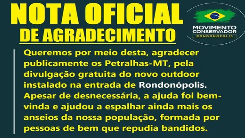 Já os responsáveis pelo outdoor, o Movimento Conservador de Rondonópolis de forma irônica respondeu em sua conta no Instagram, com um agradecimento ao diretório regional do Partido do Trabalhadores pela “divulgação gratuita” do outdoor.
