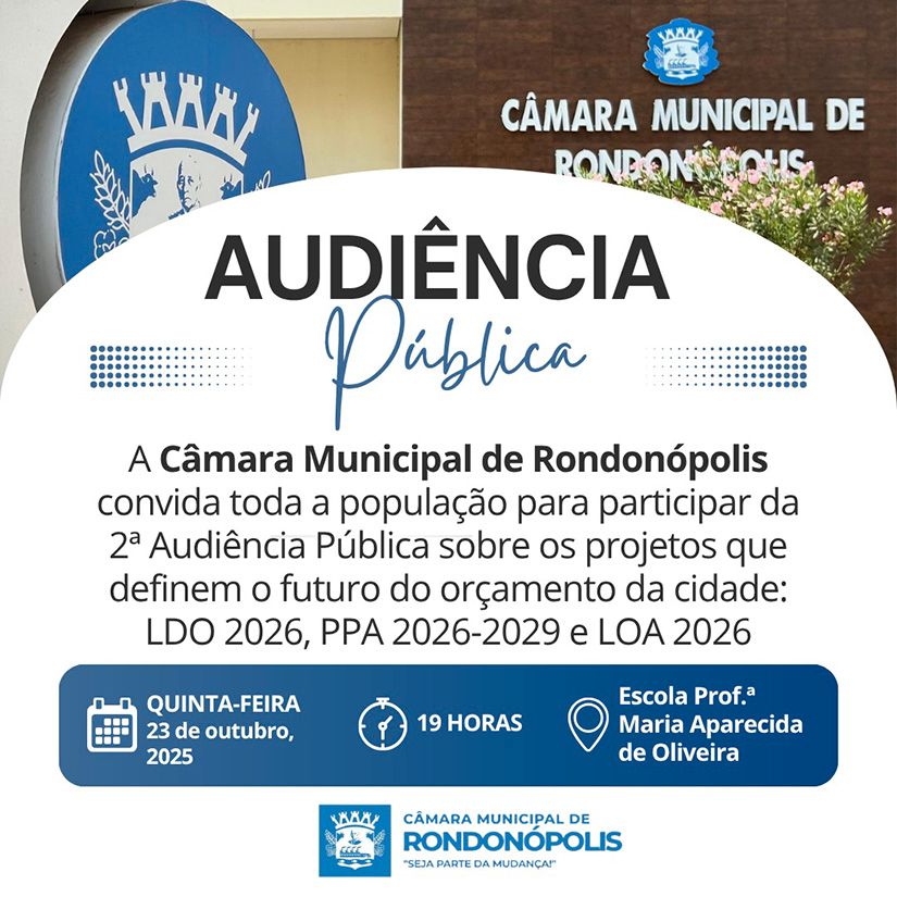 A Câmara Municipal de Rondonópolis convida toda a população para participar da 2ª Audiência Pública sobre os projetos que definem o futuro do orçamento da cidade: LDO 2026, PPA 2026-2029 e LOA 2026.