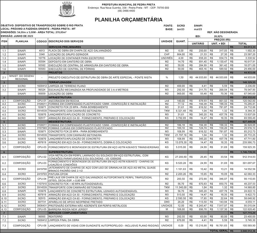 Planilha orçamentária referente ao projeto da ponte do Rio Prata