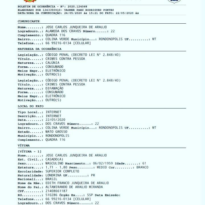 O prefeito de Rondonópolis Zé Carlos do Pátio registrou um Boletim de Ocorrência neste domingo, 24 de maio, após ter conhecimento de um áudio que está sendo replicado nas redes sociais, cujo autor utiliza de palavras de baixo calão e aponta inverdades sobre a sua pessoa.