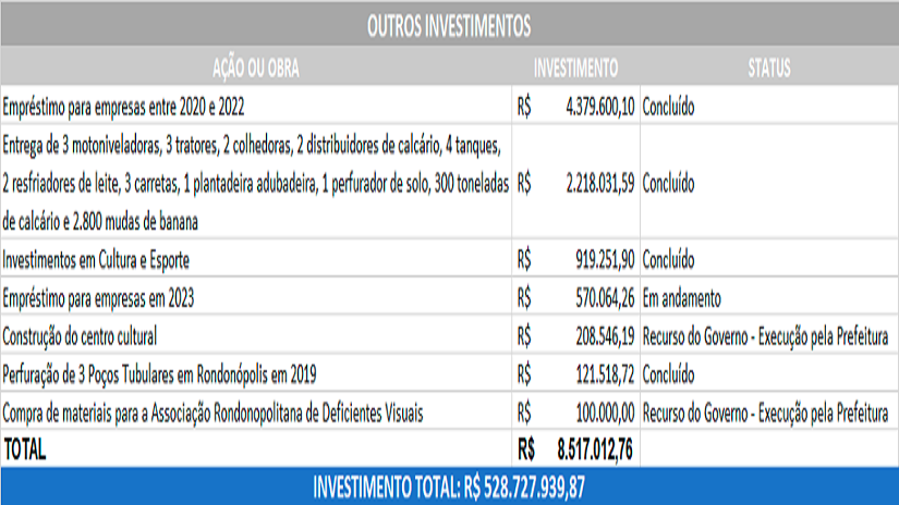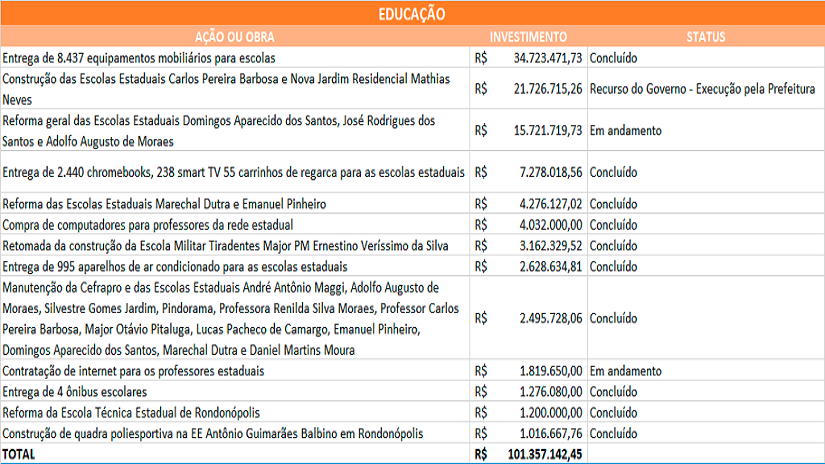 O Governo de Mato Grosso, ao longo de pouco mais de quatro anos, investiu R$ 528 milhões no município de Rondonópolis. Os principais investimentos são na área de infraestrutura, como o asfaltamento de rodovias, ruas e avenidas, e na educação, com a construção de escolas estaduais em parceria com a Prefeitura Municipal, além da entrega de chromebooks e smart TVs.