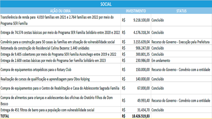 Para o social, são mais de R$ 18,3 milhões investidos no município. O principal destaque fica para a transferência de renda para quatro mil famílias em 2021 e 2,7 mil famílias em 2022, por meio do Programa SER Família Emergencial, idealizado pela primeira-dama de Mato Grosso, Virginia Mendes. No total, foram mais de R$ 9 milhões para estas ações.