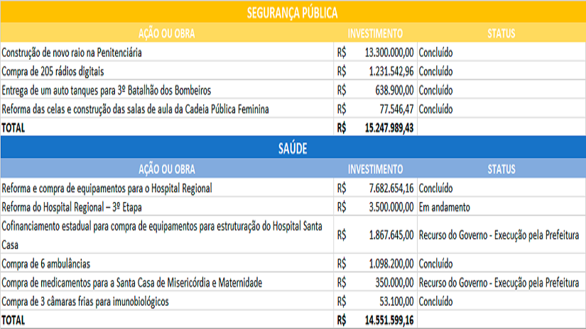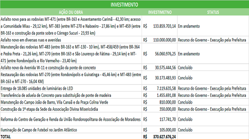 Para a infraestrutura, são mais de R$ 370,6 milhões investidos. Deste total, R$ 133,8 milhões foram destinados para a construção de 95 km de asfalto novo nas MT-471, MT-383 e MT-459. As obras destas três rodovias estão em andamento.