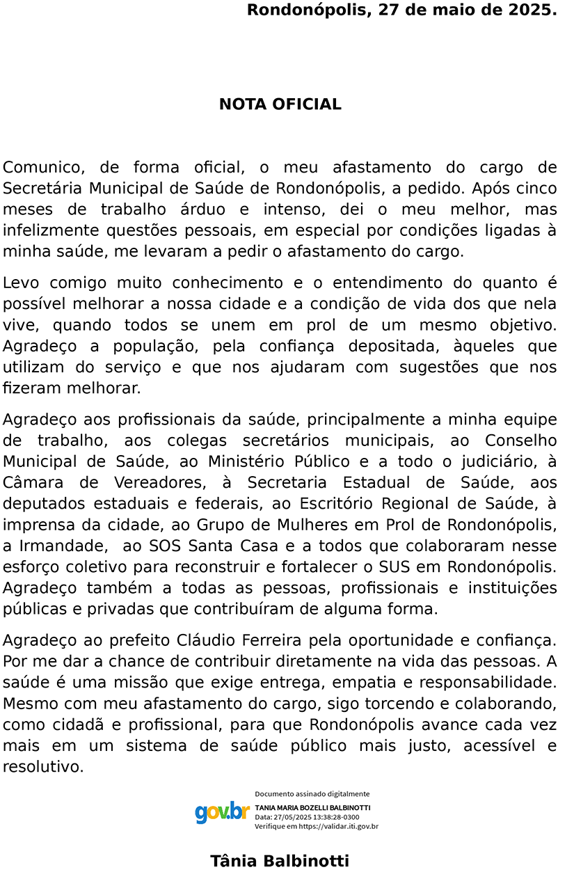 A gestão Claudio Ferreira sofre a primeira grande baixa no seu primeiro escalão, após Tânia Balbinotti comunicar nesta terça-feira (27), por meio de nota, o pedido de afastamento do cargo de secretária municipal de Saúde de Rondonópolis.