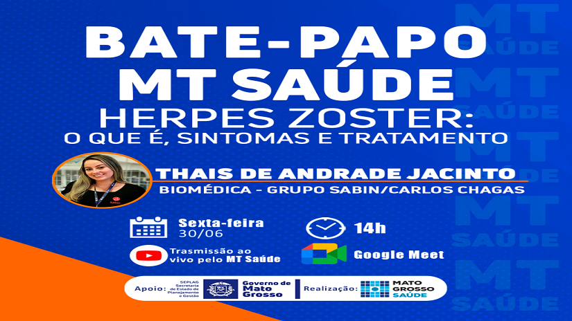 O MT Saúde realizará nesta sexta-feira (30.06), às 14h, o bate-papo online “Herpes Zoster: o que é, sintomas e tratamento". A ação objetiva chamar a atenção dos servidores públicos e da população em geral para a doença – também chamada de cobreiro –, causada pelo vírus varicela-zoster, o mesmo responsável pela catapora.
