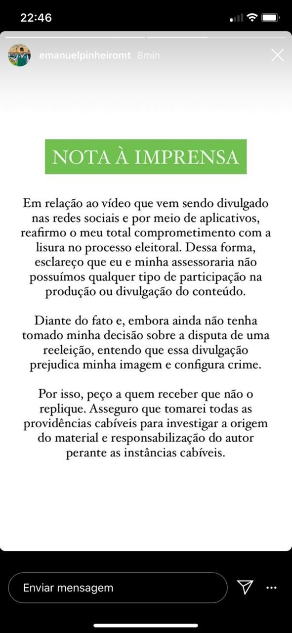 O prefeito de Cuiabá, Emanuel Pinheiro (MDB), divulgou uma nota à imprensa na noite desta quarta-feira (26), em que esclarece que não tem participação na divulgação de um vídeo em que aparece mostrando suas ações em prol da população ao longo dos seus quatro anos de mandato.