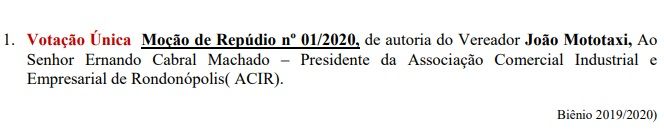 Na pauta desta quarta-feira (20), da sessão ordinária da Câmara de Vereadores de Rondonópolis (MT), uma moção de repúdio contra o presidente da Associação Comercial Industrial e Empresarial de Rondonópolis (Acir) chamou a atenção. A ação foi proposta pelo vereador João Mototaxi (PSL).