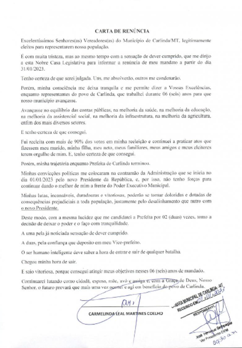 A Câmara Municipal de Carlinda, em ato representada pelo seu Presidente Vereador Jose Henrique Bertipaglia, comunicou por meio de nota, que recebeu na manhã desta terça-feira (03) recebeu da prefeita Carmelinda Leal Martines Coelho, sua Carta de Renúncia ao cargo de Prefeita Municipal.