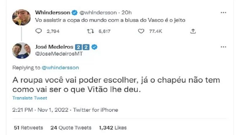 O deputado federal Zé Medeiros (PL) parece não se cansar de causar na internet e passar vergonha, por conta da necessidade quase compulsiva em aparecer mesmo quando não é provocado ou citado. A última polêmica, que para variar se deu mal foi com o humorista Whindersson Nunes, que em sua conta no Twitter ironizou “Vo [sic] assistir a copa do mundo com a blusa do Vasco é o jeito”, escreveu. Onde estaria receoso em ser confundindo com os “Verdes e Amarelos” Bolsonaristas.