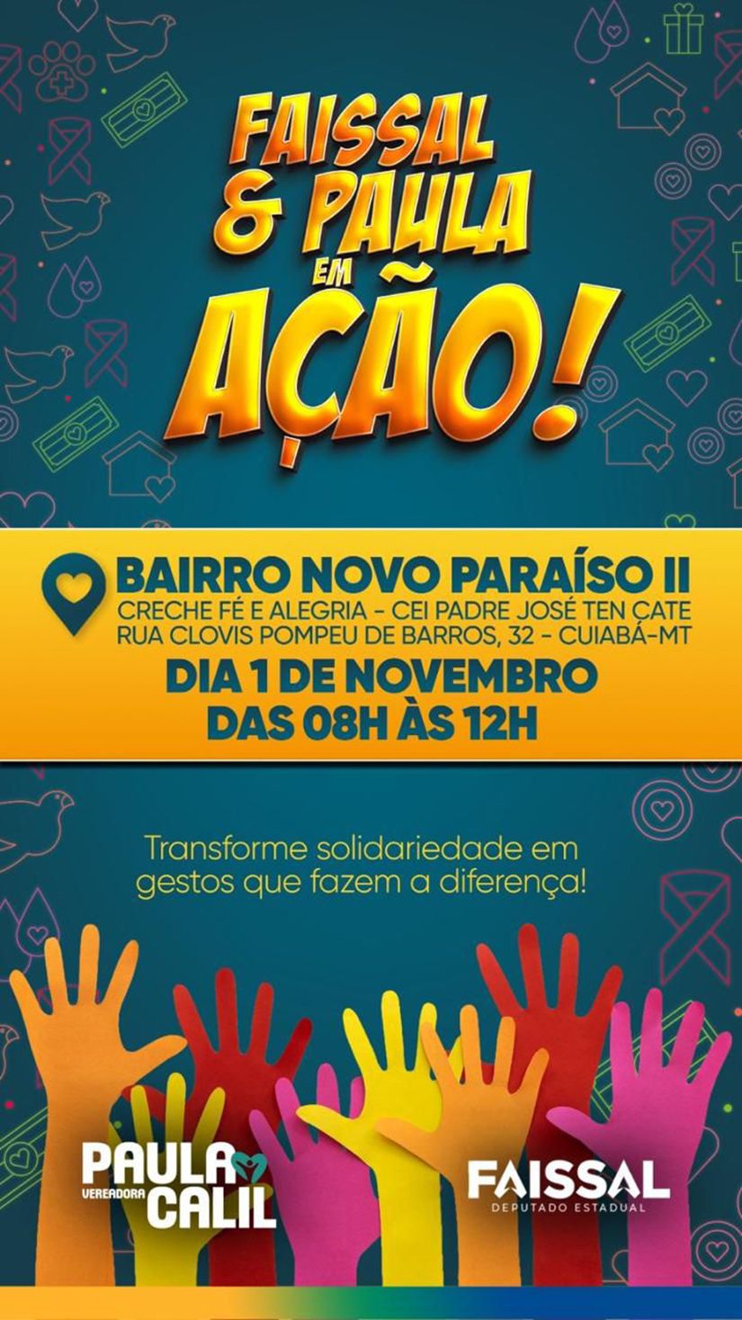 A presidente da Câmara Municipal de Cuiabá, vereadora Paula Calil (PL), promove neste sábado (1º), das 8h às 12h, o evento “Faissal e Paula em Ação - Cuidar é Transformar”, uma grande ação social voltada à população do bairro Novo Paraíso II e região. A iniciativa, realizada em parceria com o deputado estadual Faissal Calil (Cidadania), acontecerá na Creche Fé e Alegria (CEI Padre José Ten Cate), localizada na Rua Clóvis Pompeu, e vai oferecer uma ampla variedade de serviços gratuitos à comunidade.