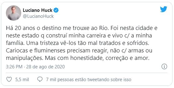 A ira do deputado federal ocorreu após uma postagem do apresentador. “Há 20 anos o destino me trouxe ao Rio. Foi nesta cidade e neste estado q construí minha carreira e vivo c/ a minha família. Uma tristeza vê-los tão mal tratados e sofridos. Cariocas e fluminenses precisam reagir, não c/ armas ou manipulações. Mas com honestidade, correção e amo”, escreveu Luciano Huck no Twitter.