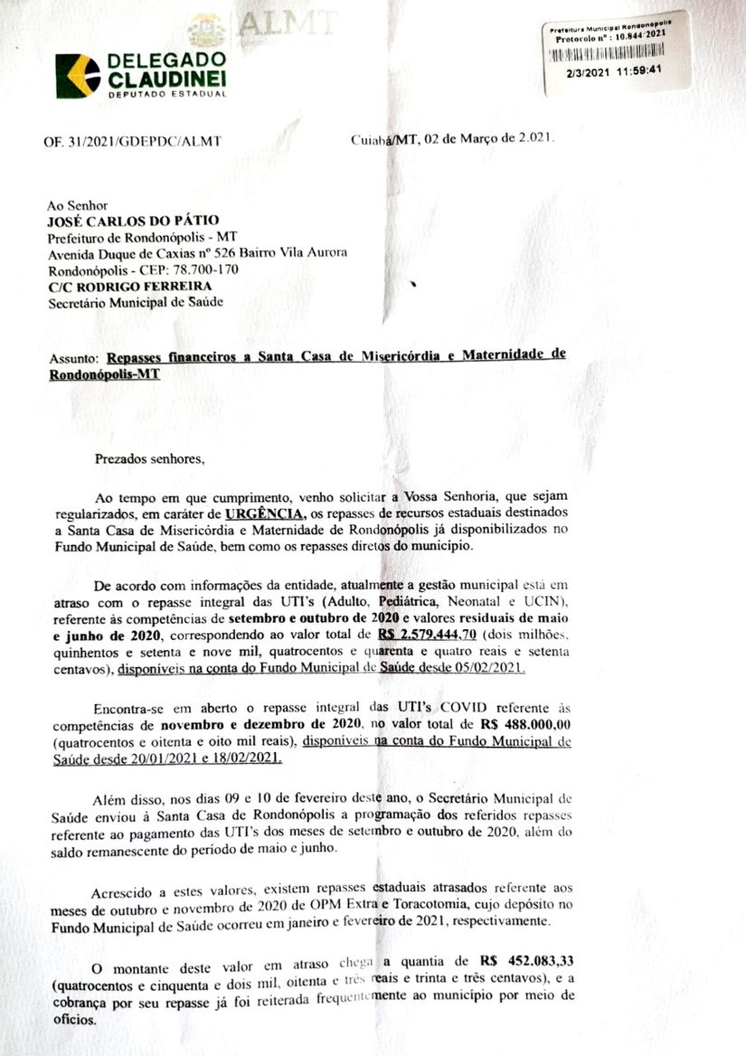 Protocolo – Nesta terça-feira (2), com o avanço da pandemia de Covid-19 e quase 90% de ocupação dos leitos da Unidade de Terapia Intensiva (UTI), o deputado Claudinei encaminhou e protocolou ofícios para o secretário de Saúde de Mato Grosso (SES), Gilberto Figueiredo, e ao prefeito municipal, José Carlos do Pátio (SD), em caráter de urgência, para a regularização dos pagamentos em atrasos para a Santa Casa de Rondonópolis que equivale a R$ 5 milhões de reais.