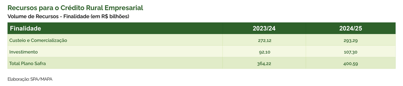 ara impulsionar o setor agropecuário brasileiro, o Governo Federal lança o Plano Safra 2024/2025, no âmbito do Ministério da Agricultura e Pecuária (Mapa), oferecendo linhas de crédito, incentivos e políticas agrícolas para médios e grandes produtores. Neste ano safra, são R$ 400,59 bilhões destinados para financiamentos, um aumento de 10% em relação à safra anterior.
