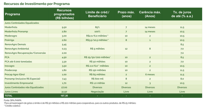 Já em relação aos recursos por beneficiário, R$ 189,09 bilhões serão com taxas controladas, direcionados para o Programa Nacional de Apoio ao Médio Produtor Rural (Pronamp) e demais produtores e cooperativas, e os outros R$ 211,5 bilhões destinados a taxas livres.