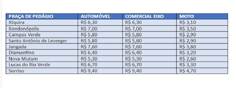 A Agência Nacional de Transportes Terrestres (ANTT) reajusta a tarifa de pedágio na BR-163/MT a partir da 0h desta quarta-feira (06.09.2023), conforme previsão em contrato que tem setembro como mês base para revisão ordinária de valores.