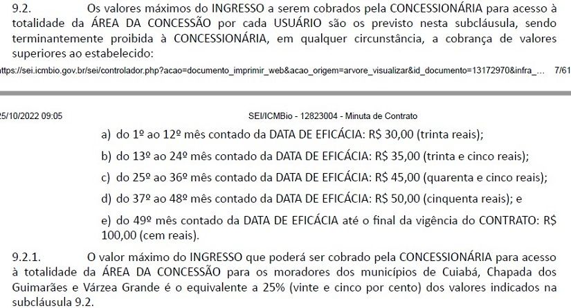 A informação consta no edital de concessão do parque. Conforme o documento, a empresa concessionária tem autorização para cobrar ingressos de acesso ao parque de forma gradativa, durante a vigência da concessão, que é de 30 anos.