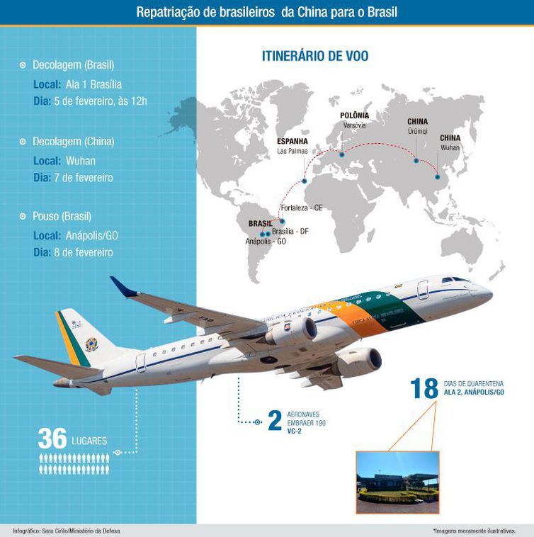 Ao deixarem Brasília, na quarta-feira (5), as aeronaves brasileiras fizeram escala em Fortaleza (CE), Las Palmas (Espanha), Varsóvia (Polônia) e Ürumqi (China), até o destino final em Wuhan. A viagem de volta prevê escalas nos mesmos locais. Os estrangeiros desembarcarão em Varsóvia.