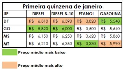 Dados do Índice de Preços Edenred Ticket Log (IPTL), levantamento que consolida o comportamento de preços das transações nos postos de combustível, trazendo uma média precisa, apontaram que na Região Centro-Oeste o preço médio do litro da gasolina fechou janeiro a R$ 5,80, com aumento de 0,52% e o etanol foi comercializado a R$ 3,49, menor média do país, mesmo após aumento de 0,87%. Já o preço do diesel comum reduziu 0,33% na região, ante a primeira quinzena, e fechou a R$ 6 e o S-10 foi comercializado a R$ 6,17, com recuo de 0,64%.