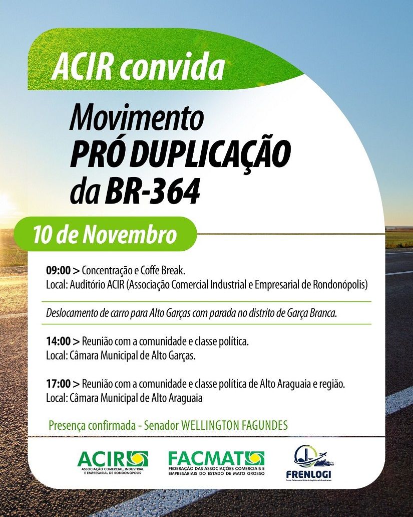 Nesta sexta-feira (10), o Movimento Pró Duplicação da BR 364 realizará duas importantes reuniões nos municípios de Alto Garças e Alto Araguaia, para discutir o projeto de duplicação da Rodovia Federal 364 que liga Rondonópolis a Jatai/GO. O movimento conta com a participação de associações comerciais das cidades que são cortadas pela rodovia e tem apoio de deputados federais e do senador Wellington Fagundes.
